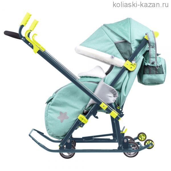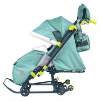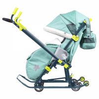 Коляска комбинированная с трансформируемым кузовом позволяет передвигаться по любой дороге. Нажатием ноги на педаль опускаются колеса, и вы можете везти коляску по асфальту или по гладкому полу. Еще одно нажатие — коляска трансформируется в санки и снова скользить по снегу!