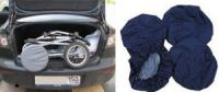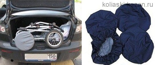 В комплект входит 4 чехла из капроновой ткани(темно-синий цвет), с водоотталкивающей пропиткой. Чехол представляет собой круг с пришитой по краю резинкой для фиксации на колесе. Чехлы надеваются на колеса коляски при ее транспортировке и хранении.