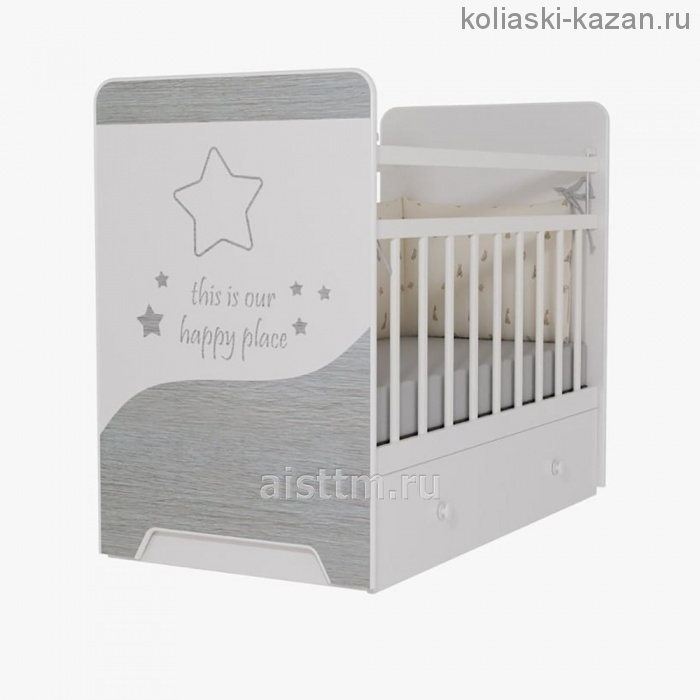Недорогая классическая кроватка с декоративным оформлением, маятником и ящиком.