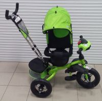 Велосипед имеет прочную раму, ремни безопасности и ограничивающий бампер с разделителем между ножек, регулируемую в двух положениях ручку-толкатель, ножной тормоз, складные подставки для ножек.