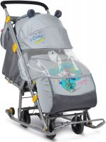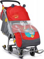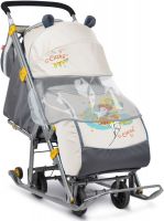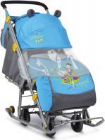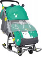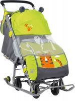 Коляска комбинированная с трансформируемым кузовом позволяет передвигаться по любой дороге. Нажатием ноги на педаль опускаются колеса, и вы можете везти коляску по асфальту или по гладкому полу. Еще одно нажатие — коляска трансформируется в санки и снова скользить по снегу!