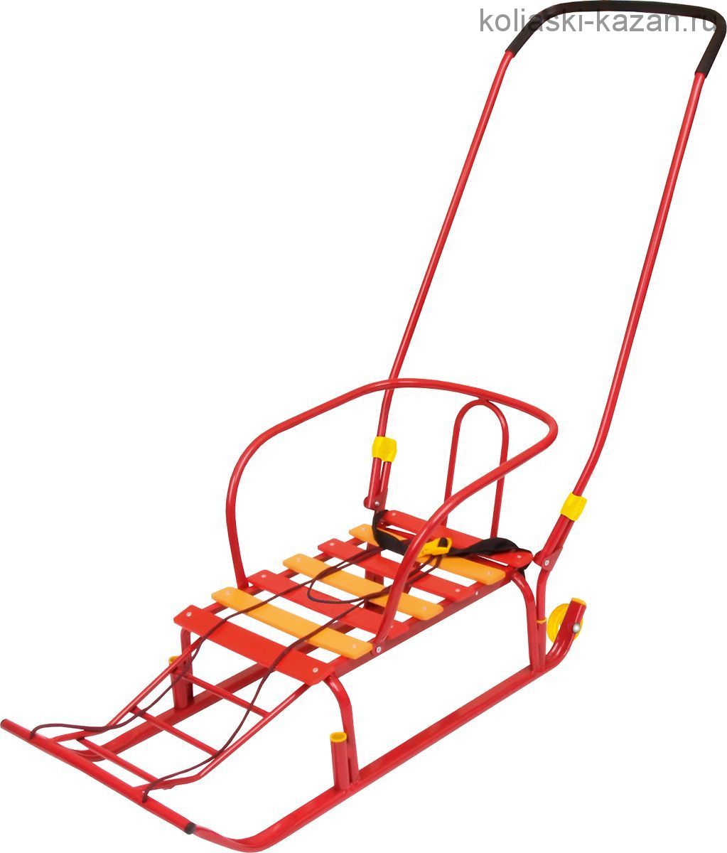 Материал: каркас – металл; сидение – деревянные рейки; ремень безопасности – ременная лента; колеса – морозостойкая пластмасса