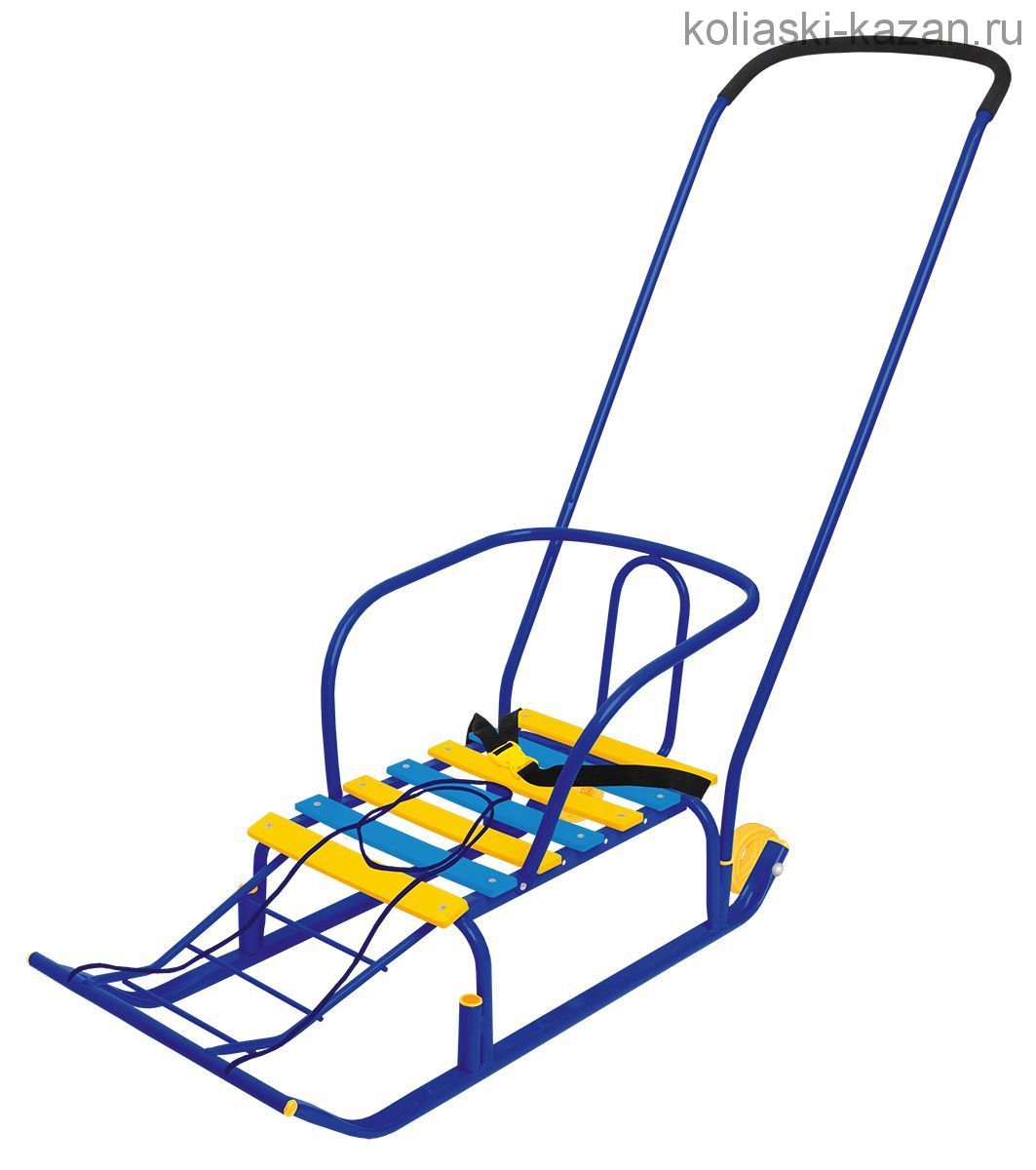 Материал: каркас – металл; сидение – деревянные рейки; ремень безопасности – ременная лента; колеса – морозостойкая пластмасса
