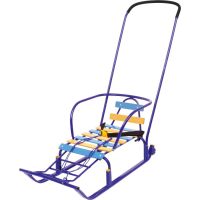 Материал: каркас – металл; сидение и спинка – деревянные рейки; ремень безопасности – ременная лента; колеса – морозостойкая пластмасса