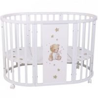 Изящный дизайн, плавные линии, умеренная цена и высокое качество обработки дерева- вот главное преимущество этой модели!На боковине изображен принт медвежонка- Лучик. Благодаря съемной секции, кроватку удобно ставить к родительской кровати. Когда ребенок подрастет, можно использовать как детский стульчик и диванчик. Люлька и кроватка проходят в стандартный дверной проем. Съемные колесные опоры со стопором снабжены бесшумным силиконовым покрытием. Опора выдерживает нагрузку до 291 кг. Для защиты зубок ребенка и поверхности ограждения, на верхние планки кроватки крепятся специальные накладки "грызунки". Трансформируется в диванчик.