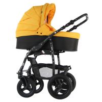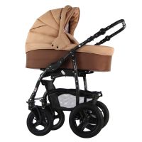 Коляска выполнена из плотной непромокаемой ткани , а внутренняя отделка состоит 100% хлопка. Дно люльки деревянное с регулирующимся подголовником, для комфорта малыша в комплект входит матрасик, который выполнен из холлофайбера. Просторная люлька для младенца позволит комфортно разместиться малышу любой комплекции.